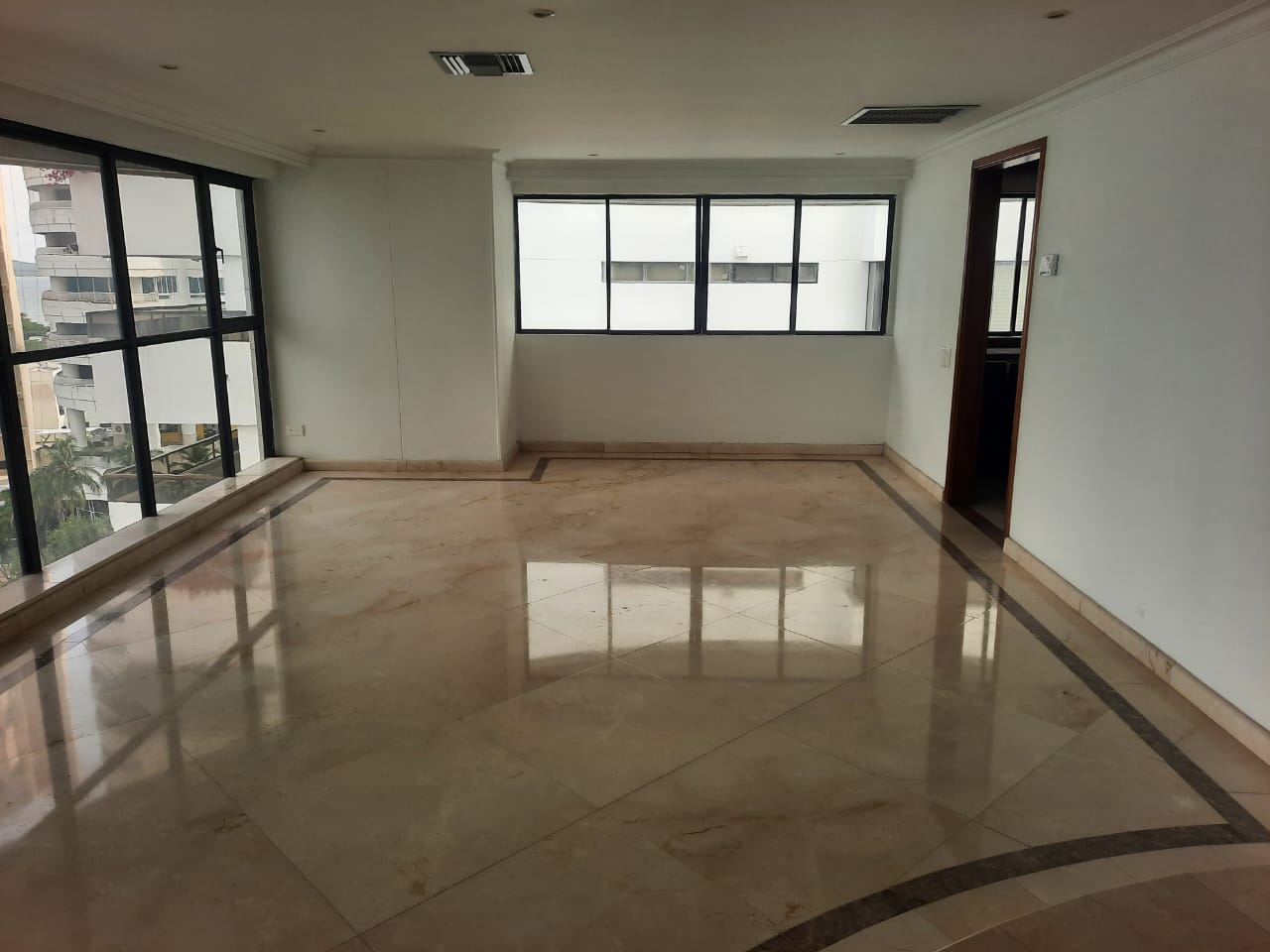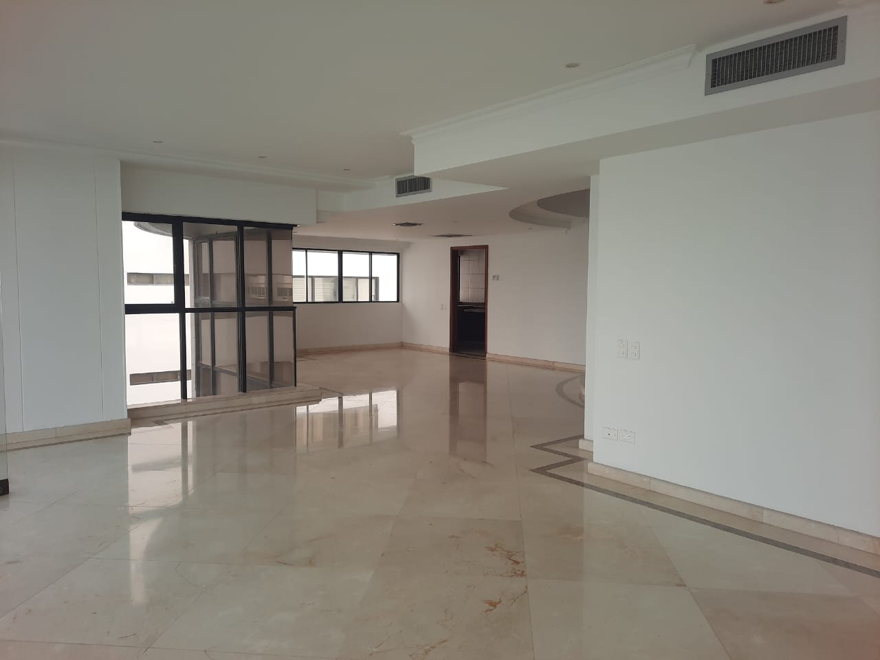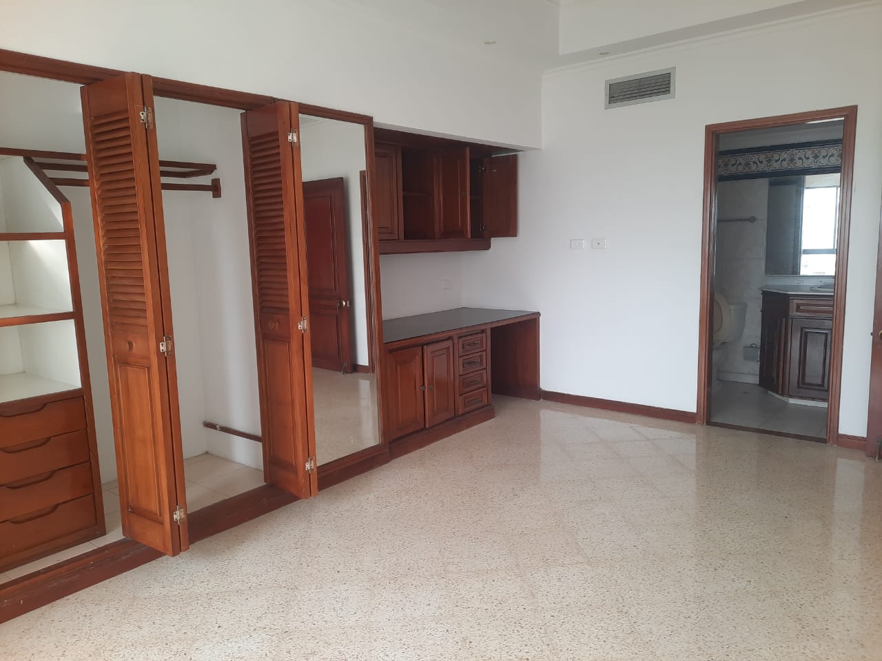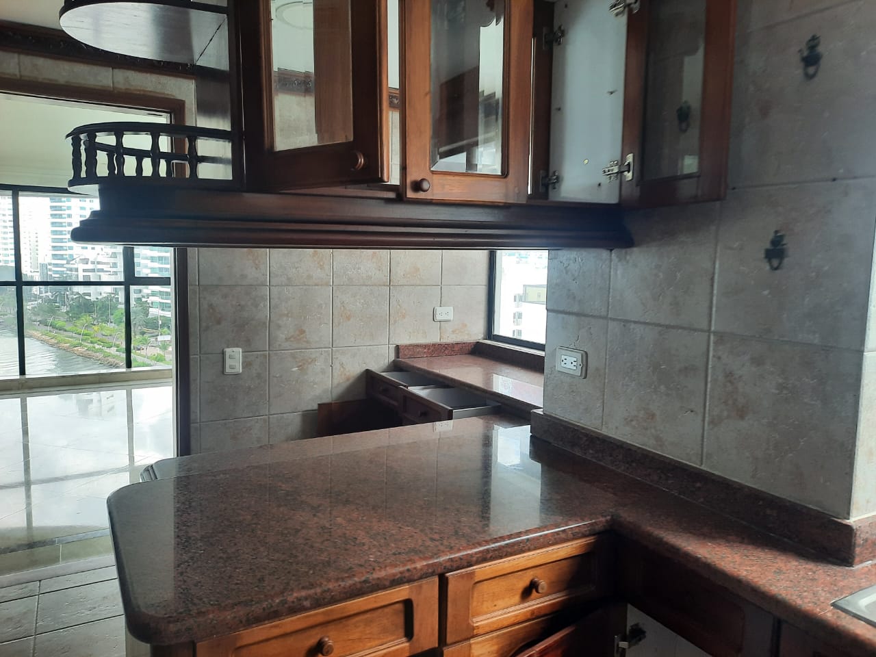 Apartamento residencial con vista a la bahía, amplio de 3 alcobas, 4 baños, sala, comedor, sala de estar, cocina, cuarto y baño del servicio, balcón y 2 garajes. El edificio ofrece vigilancia 24 horas, zona social con piscina.