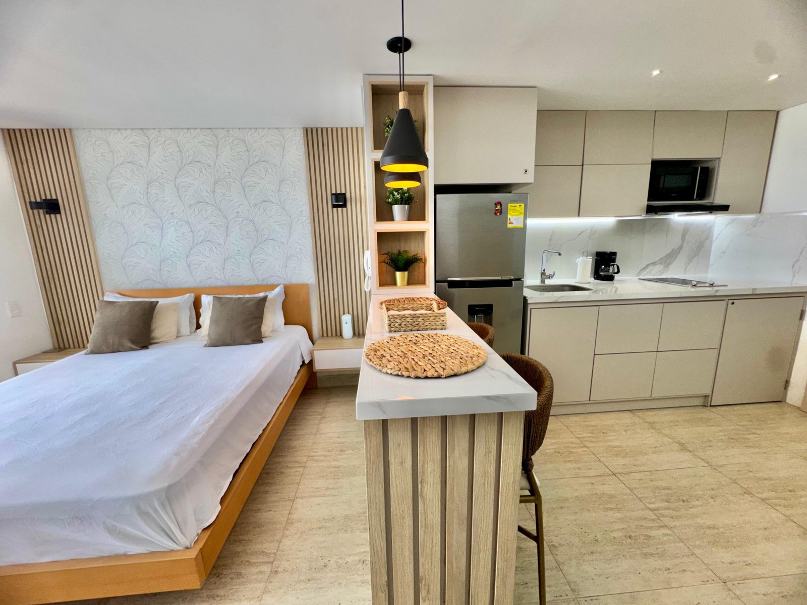 Apartamento de uso turístico con vista al mar de tipo loft con un baño y cocina abierta y balcón. El edificio cuenta con piscina, jacuzzi, sauna y turco, parking privado y vigilancia 24/7 .