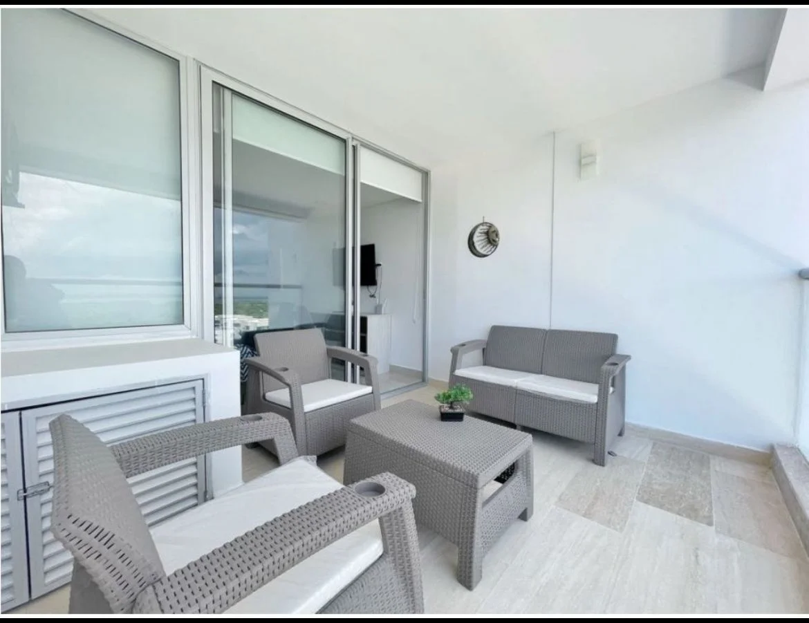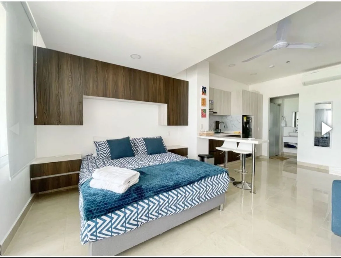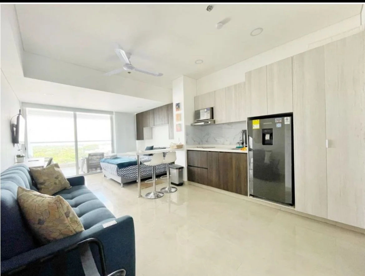 Apartamento con vista hacia la ciénega de la virgen, 1 alcoba, un baño, cocineta y balcón. El edificio ofrece vigilancia 24/7, piscina, privada, zona de parqueaderos internos para uso exclusivo de huéspedes y un centro comercial y área de comidas próximamente entrara en funcionamiento.