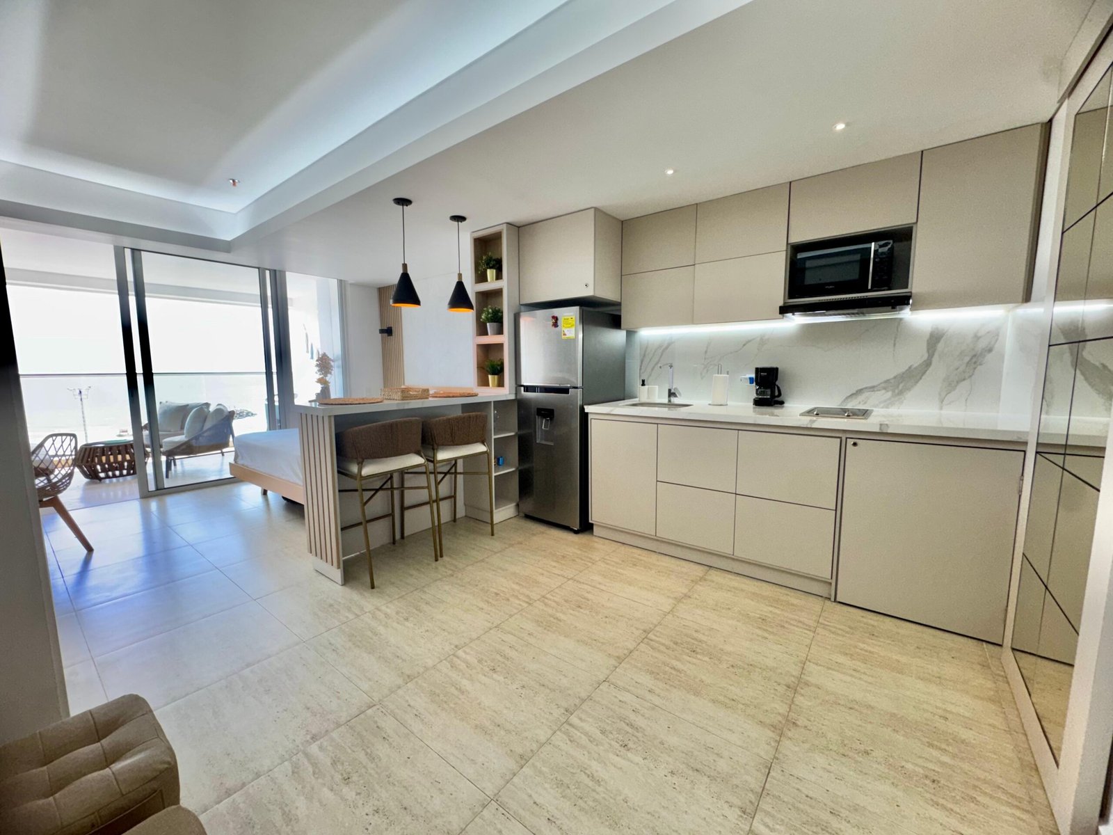 Apartamento de uso turístico con vista al mar de tipo loft con un baño y cocina abierta y balcón. El edificio cuenta con piscina, jacuzzi, sauna y turco, parking privado y vigilancia 24/7 .