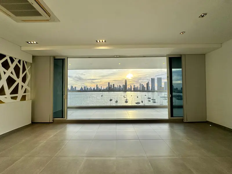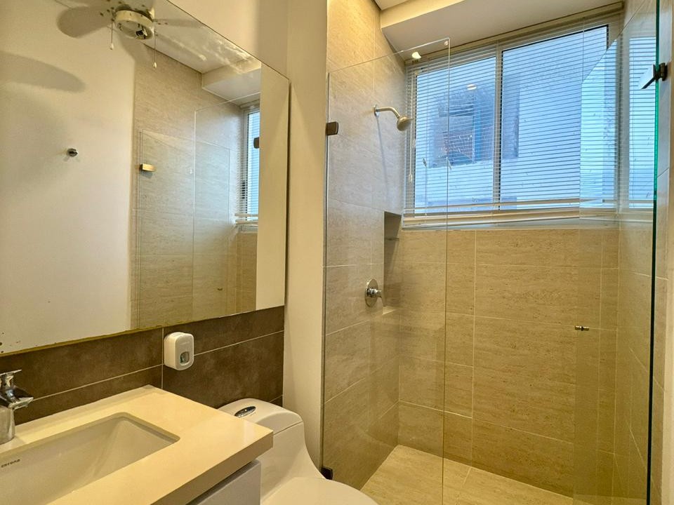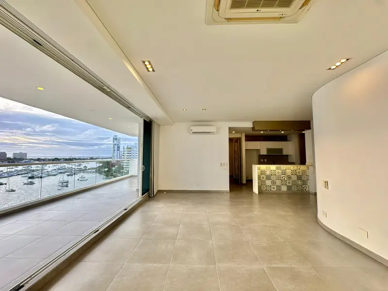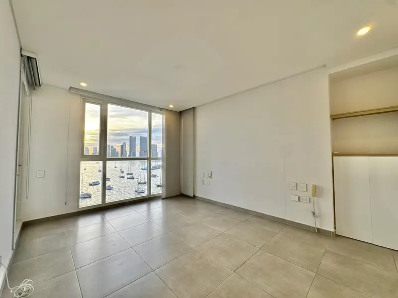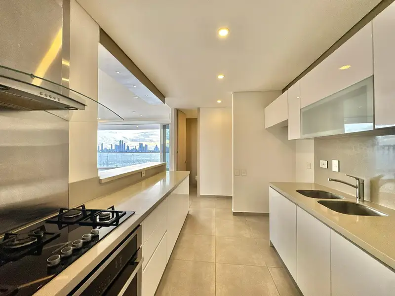 Apartamento con vista a la bahía y excelente acabados de 3 alcobas, 3 baños, cocina tipo americano, balcón, hall de alcobas, mueble de biblioteca, closet de lino, cortina automatizadas, 2 garajes y 1 locker. El edificio ofrece zona social, piscina para niños y adultos, gimnasio, baño turco y vigilancia 24 horas.