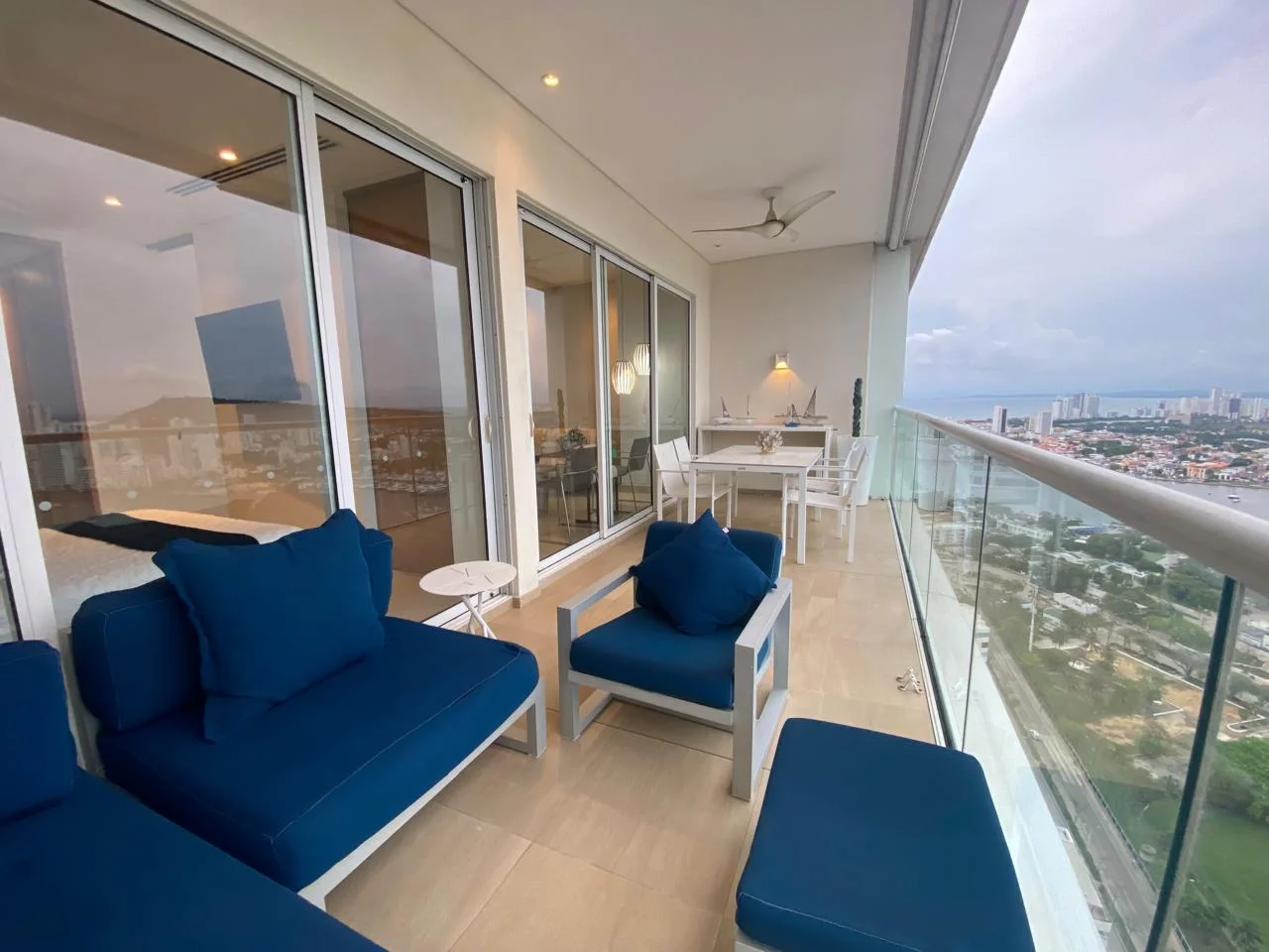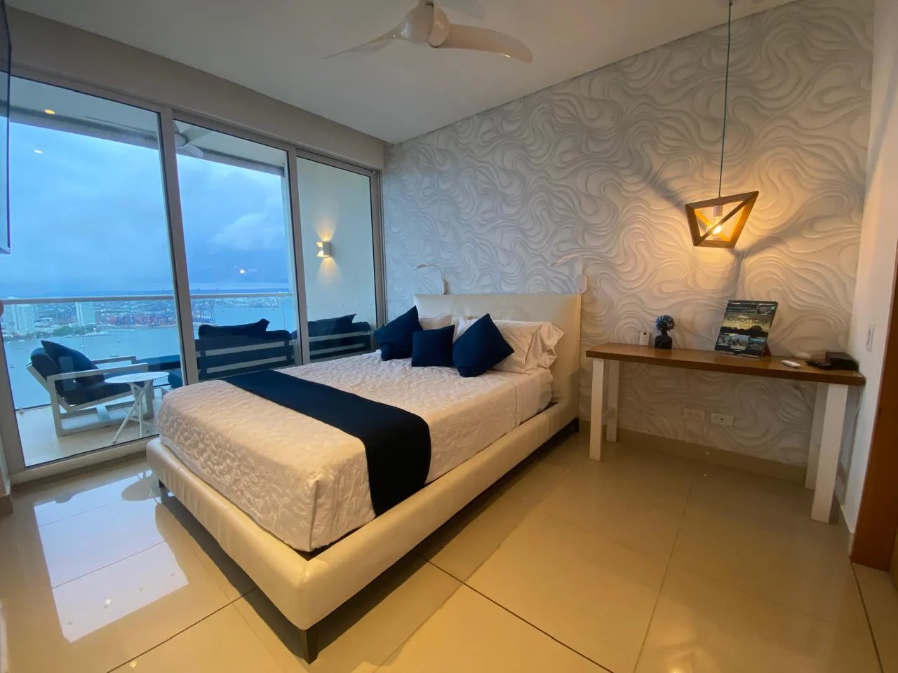 Apartamento en Bocagrande, Cartagena, con 3 alcobas, 3 baños, balcón y garaje. Ubicado en piso 14 con vista panorámica, cuenta con jacuzzi, cocina equipada, gimnasio, piscina y acceso a playas, ideal